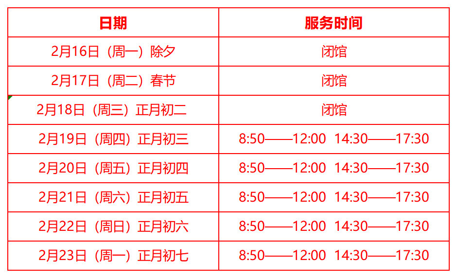 备注:2月16日—2月18日全天闭馆,进行系统维护、整理书籍及大扫除,2月19日—2月23日(白天,8:50-12:00 14:30-17:30开馆,晚上18:30-21:00闭馆装订杂志、报刊),2月24日起正常开馆。请读者朋友们相互转告,给大家带来的不便,敬请谅解!宁南图书馆全体员工恭祝大家新春吉祥、阖家欢乐!
