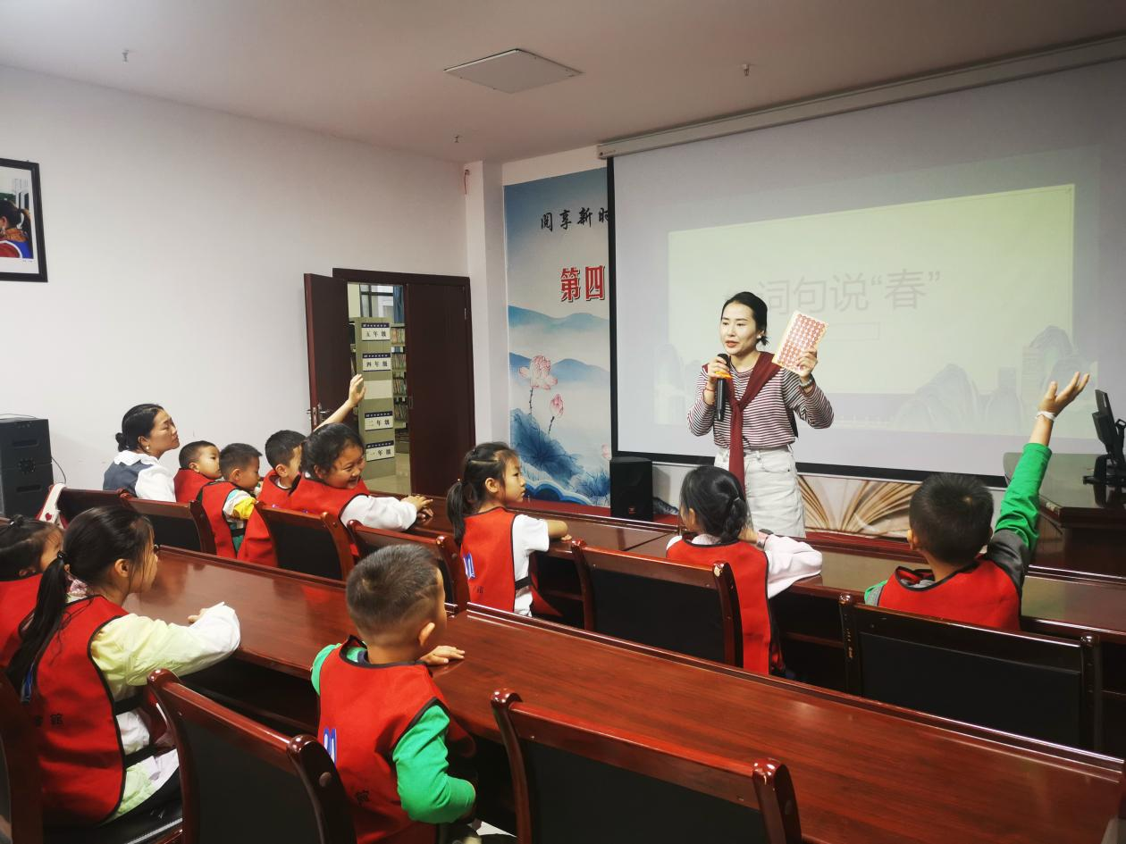 绘本讲读结束后,现场开展“说春”趣味互动,小朋友们踊跃举手,争相说出带“春”字的词语、成语及经典诗句:春风、春雨、春暖花开、春回大地,以及“春眠不觉晓”“春风又绿江南岸”“好雨知时节,当春乃发生”,老师为积极参与的孩子奖励了小红花,现场气氛热烈,童趣盎然,在互动中加深了对春日文化的理解。